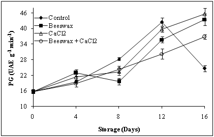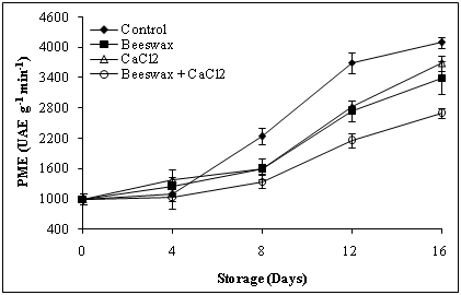 During storage, pectinamethylesterase (PME) activity increased significantly after the 8th day of storage (Figure 3B). In the fruits of the control treatment there was an increase about four times between day 0 (1000.87 UAE g-1 min-1) and the 16th day (41000.67 UAE g-1 min-1) differing (p<0.05) of the other treatments, especially those immersed in the combined solution of beeswax + CaCl2 whose activity was twice less (2056.94 UAE g-1 min-1) compared to the control at the end of storage. Regarding the activity of polygalacturonase (PG) (Figure 3C), the most significant increase occurred from the 8 day on, coinciding with the reduction in the total pectin content (Figure 2F). During storage, the fruits of the combined treatment of beeswax + CaCl2 was characterized by lower PG activity (28.77 UAE g-1 min-1) compared to the other treatments (p<0.05).