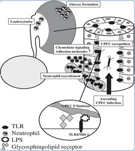 As a result of relationship between uro-pathogen and host, UTIs occur. Their pathophysiology requires a multiple step process.27 Initially, the uro-pathogen binds to the epithelial surface. Then it subsequently colonizes and spreads across the mucosa which causes the tissue to be damaged. After the early colonization period, the pathogens can then enter into the urinary bladder which results in symptomatic or asymptomatic bacteriuria.28