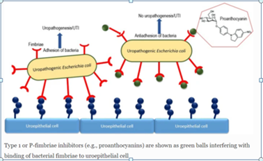 There are two compounds that are responsible to block attachment of E. coli in UTI patients. First is fructose, which restrains mannose-sensitive fimbrial adhesions; the second is a high atomic weight compound that restrains the mannose-resistant adhesions of uropathogenic E. coli. Almost all fruit juices contain first compound i.e., fructose, but only Vaccinium berries juices (i.e., cranberries and blueberries) contain this extraordinary second compound, later named as “pro-anthocyanidin.” Interestingly, pro-anthocyanidin is strongly effective against mannose-resistant adhesins that is produced by E. coli present in Urine samples but show very light effect against E. coli present in fecal samples.17 Proanthocyanins in cranberry have important role in reduction of bacterial adhesion, urine PH and chances of UTI.18