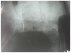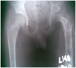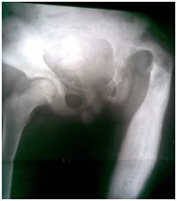 Figure 1 Initial radio graph- Femoral head dislocated supra-laterally, Shaper cook deformity of left femoral cortices are sclerosed, a large hyper dense area in the medullary cavity sequestrum. Pelvis tilted on the right.
