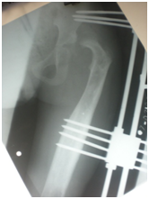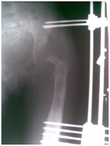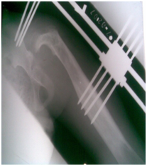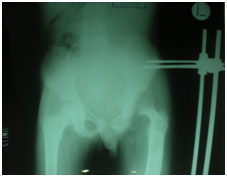 Figure 2 Across hip Naseer Awais External Fixator applied for control distraction of proximally migrated femoral head, 2mm per day.