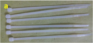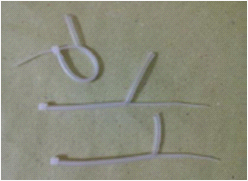 Immediately following fasciotomy and/or debridement and irrigation while the patient still in anesthesia, the plastic bands (Figure 1A), sterilized using ethylene oxide gas,1,2 were first threaded into a piece of sterile size 10 nasogastric tube (Figure 1B) which protects the skin from the sharp edge of the band cutting through; then the threaded band is inserted approximately 2-3 cm apart through a full thickness small stab wound 1 cm from the wound edge.2 The number of bands will depend on the length of the wound. All bands will be locked without exerting undue tension on the skin margins. The bands will be tightened every 48 hrs, gradually by 2-3 clicks (approximately 2-3mm) without overstretching the skin, until the wound edges approximated and finally stitched under local.