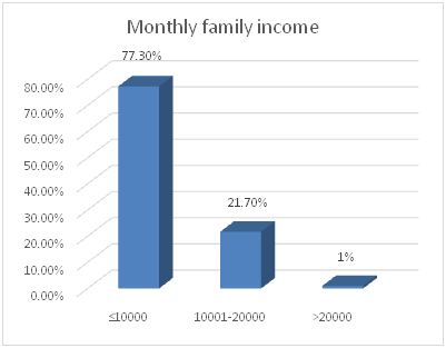 Most of the respondents (77.30%) earned ≤10000 BDT monthly whereas 21.70% had monthly income 10001-20000 BDT and only 1% had monthly family income >20000 BDT (Figure 2).