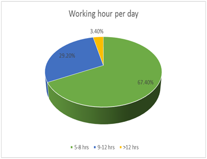About 67.40% respondents worked in the field 5-8 hours per day and 29.20% did work 9-12 hours per day as well as only 3.40% worked >12 hours per day (Figure 3).