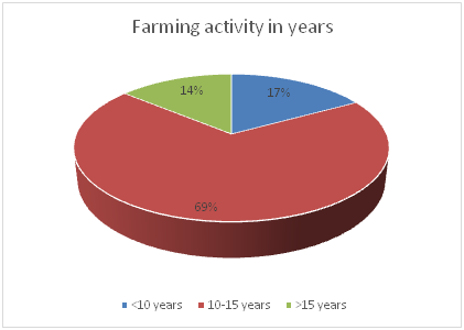 About two-third of the respondents (69%) worked in farming activity for 10-15 years followed by 17% for <10 years and 14% for >15 years (Figure 4).