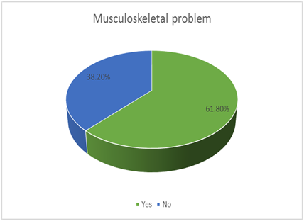 About 61.80% farmers suffered some form of musculoskeletal problem and 38.20% did not have musculoskeletal problem (Figure 5).