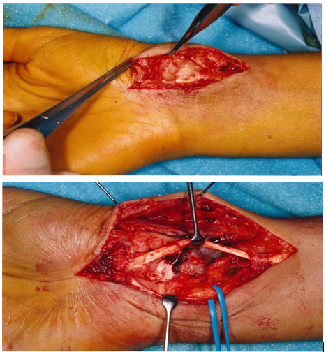 Physical examination revealed a smooth painless mass, 3 cm in diameter, at the volar-radial side of her right wrist just above the flexor carpi radialis tendon. Based on these clinical findings the diagnosis: volar wrist ganglion cyst was made. No additional diagnotics were obtained and surgery was planned.