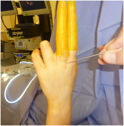 The appropriately anaesthetised patient is positioned supine with an arm table attached on the operative side. An above elbow tourniquet is applied. A drip stand is then attached to the table at the level of the shoulder on the surgical side. The limb is prepared and draped, such that the sterile sheets completely cover the drip stand. Chinese finger traps are then placed upon the index and middle fingers. A four-inch crepe bandage is securely tied in to a loop and then hung from the drip stand. The finger traps can then be suspended from this so that the elbow is approximately six-inches from the arm table (Figure 1). The remainder of the four-inch crepe bandage is looped around the upper limb and tied underneath the arm table in to another loop, from which counter-traction weights can be suspended (Figure 2). We recommend sufficient counter traction such that the metacarpophalyngeal (MCP) joints of the index and middle fingers are both palpably and visibly distracted (Figure 3). This should enable adequate joint distraction, in addition to being able to manipulate the wrist in both coronal and sagittal planes as required during arthroscopic assessment. The set-up and traction is now complete, providing excellent access for portal placement and subsequent safe arthroscopy. This avoids the scuffing of the wrist and carpus that may occur when instruments are inserted in the context of suboptimal traction.