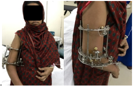 Baruah and Patowary suggested protocol for the treatment of Postponed Fracture (PF)/Neglected Fracture with Fixation in situ (FIS) distraction done 1st at the rate of 0.25 mm, 2 times in a day for 7 days followed by rest for 3-4 days. Then, compression done at the same rate followed by rest. After 2 cycles of AM, final compression was done at the rate of 0.25 mm on every 3rd day for 1 month,13 and for hypo-regenerate and infected non-union management (B & P) follow Compression for 10 days followed by distraction up to 10 mm - 20 mm at the rate of 0.25 mm 2 times in a day, then rest for 7-10 days, after that slow compression again up to 7 mm-10 mm. After a rest period for 5-7 days, distraction is performed for 2nd time.23–25 Kulkarni suggested protocol for AM in hypertrophic non-union as distraction 0.5 mm/day for 20 days, followed by rest for next 20 days and final compression was done. We follow Baruah and Patowary suggested protocol of AM in all cases.1