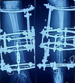 Introduction: Accordion Maneuver is the “Bloodless Stimulation” of bone healing described by Professor G. A. Ilizarov. It converts biologically inactive tissue into tissue capable of neo-osteogenesis. The suggested management of non-union, hypo-regeneration and infection with implant failure by a single stage procedure with minimal or no debridement and if implant is provide sufficient stability it placed in situ.
