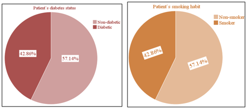 Sex and medical co-morbidities: Male was 71.43% and female 28.57%. Diabetes 42.86%, smoker 42.86%. All patients need NSAIDs during treatment (Graph 2).