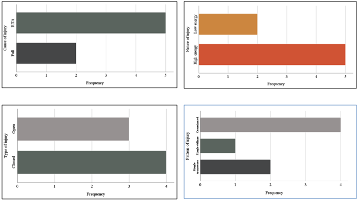 Cause, nature, type and pattern of injury: Main cause of injury was RTA. 5 patient`s injury due to RTA and 2 for fall. Most of the cases were high energy trauma. 4 were closed and 3 open fracture. Comminuted fracture-4, simple oblique-1 and simple transverse- 2 fracture in this study. I patient was H/O- poly-trauma. 4 patients reached in hospital with 6 hrs of injury and 3 patients after 6 hrs (Graph 3).