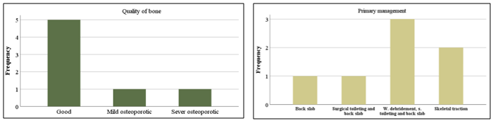 Bone injury, site of bone affected, bone quality and primary management: Bone fracture found, Humerus-1, Radius & Ulna-1, Femur-2 and Tibia & Fibula-3. Proximal shaft fracture-1, mid shaft-3 and distal shaft- 3. 1 patient was mild osteoporotic, 1 sever osteoporotic and rest of the patients was good bone quality. Primary management was given1 patient by back slab, 1surgical toileting with back slab, 3 patients was needed surgical toileting, wound debridement with back slab and 2 patients given skeletal traction (Graph 4).