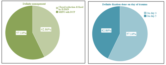 Definite management, post-operative and follow up complications: 42.86% cases done closed reduction & fixed by ILIMN and 57.14% MIPO with DCP. Definite fixation done on day 3- 57.14% cases and on day 5- 42.86% cases. There were no post-operative complications of the patients. Within1-3 months of follow up 4 patients complaints pain after fall and 3 patients found signs of infection (Graph 5).