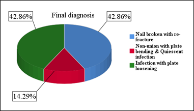 Our study of 3 years from 2019 to 2021, the patients were diagnosed as, nail broken with re-fracture- 3, plate bending with quiescent infection- 1 and infection with plate loosening- 3.