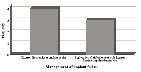 Management of implant failure cases: 4 patients were managed by Ilizarov fixation kept implant in situ and 3 patients were done exploration & debridement with Ilizarov fixation kept implant in situ, wound closed by secondary closure. Tourniquet applied in 4 patients (Graph 7).