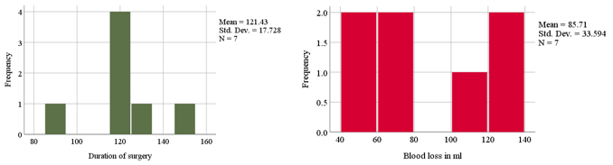 Duration and blood loss in surgery: Mean duration of surgery was 121.43(±17.728) minutes. Mean blood loss 85.71(±33.594) ml (Graph 8).