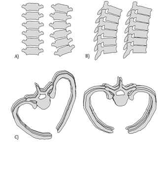 b) Sagittal plane: Left: Normal thoracic vertebrae. Right: Sagittal changes result in a relative lordosis in the thoracic spine (kyphotic angle less than 20 degrees).