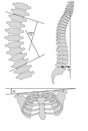 AnatomyWhile often characterized by the lateral curvature of the spine, adolescent idiopathic scoliosis is a three dimensional deformity involving multiplaner vertebral changes (Figure 1). In addition to vertebral rotation in the coronal plane producing the lateral curvature, changes also occur in the sagittal and transverse planes. In the sagittal plane, a relative lordosis is generally observed in involved vertebrae of the thoracic spine. In the transverse plane, vertebrae are rotated such that the spinous processes point toward the curves concavity. The subsequent change in costal positioning that this produces in the thoracic spine results in the rotational prominence that is typically observed when a patient with AIS assumes the leaning forward position.26