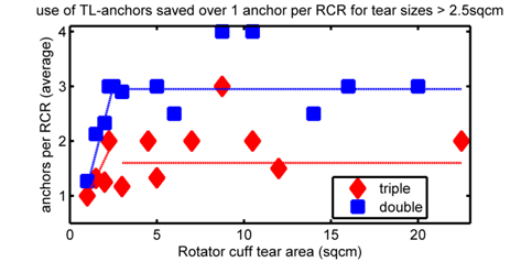 The use of triple- loaded anchors can result in significant savings for repair of large RC tears defined as either AP length > 3 cm or tear area ≥3cm2. The use of AP*LM as a measure of tear size is more descriptive than AP length as it encompasses the number of tendons involved in the tear. Cost savings result from the elimination of one anchor per case for large tears.