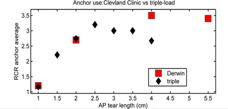 Figure 2 Average anchor usage as a function of AP tear length reported by Derwin et al.11 compared to the TL-anchor use reported here.