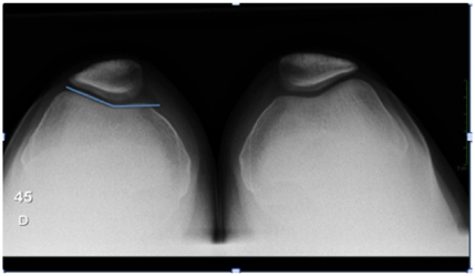 Figure 1 45º x-ray patellofemoral view (Merchant view) demonstrating trochlear groove angle > 145º and type III patella according to the Wiberg classification.
