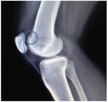 Figure 2 X-ray knee lateral view showing crossing sign (circle) and normal patella height by Insall-Salvati ratio (lines); no arthritic changes are seen.