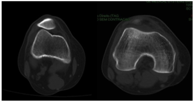 Figure 3 Knee axial CT scanning; Patella tilt and translation (left) and type a trochlear groove dysplasia (right).