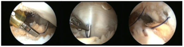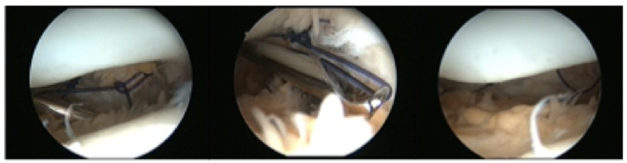 Figure 4 Intra operative arthroscopic images showing the suture limbs being passed in the medial retinaculum over the Tuohy needle, and the final aspect before knot tying, after the synovial abrasion between suture limbs