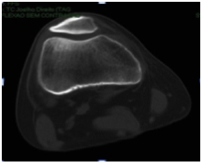 Knee radiograph evaluation (Figure 1 & 2) demonstrated a trochlear groove angle > 145º and type III patella according to the Wiberg classification as well as a crossing sign; there were no arthritic changes and no patella alta or baja; CT scan (Figure 3) showed femoral trochlea dysplasia, normal TT-TG, patella external translation and patella chondromalacia; MRI had the same findings as the CT and reported normal menisci and ligaments.