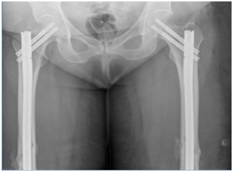 A 71 year old post menopausal Caucasian woman with elevated BMI of 34 & NIDDM, presented to the emergency department with acute severe bilateral thigh pain and inability to weight bear following a low impact fall from standing height. She also complained of an 18 month history of bilateral thigh, groin & back pain, for which she was diagnosed with “fibromyalgia”. She had been taking ibandronic acid 150mg by mouth monthly for the last 5 years for the treatment of postmenopausal osteoporosis. Plain radiographs of both limbs revealed a displaced fracture in mid-shaft region of both femori (Figure 1). Ibandronic acid was stopped and the patient underwent internal fixation with bilateral intramedullary reconstruction nails, locked proximally and distally (Figures 2 & 3). The patient made uneventful post-operative recovery and was subsequently discharged with outpatient follow-up.