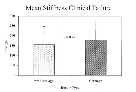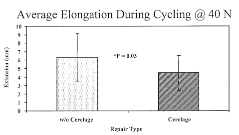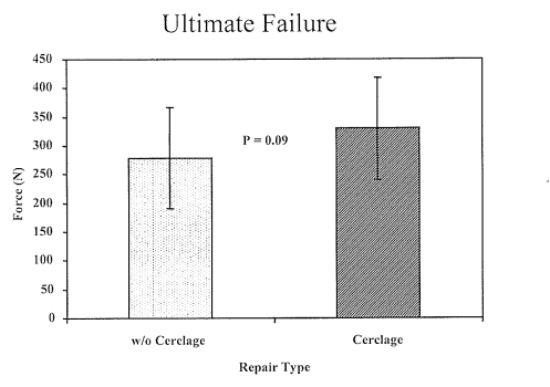Figure 2 Average force (Newtons ± standard deviation) required to produce 8 mm of elongation in the cerclage augmented repairs, and the non-cerclage group. There was no significant difference (p = 0.27) in the force required between these two groups.