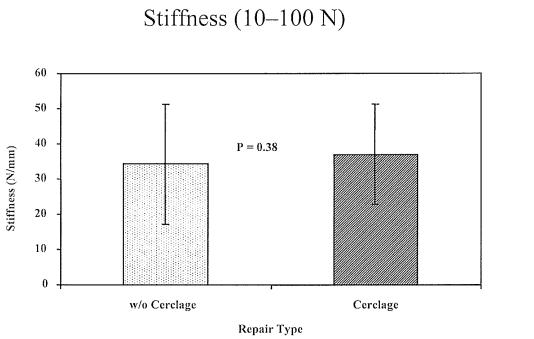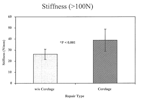 Figure 4 Mean stiffness (N/mm ± standard deviation) of the repairs in both groups between 100 Newtons and ultimate failure load. The cerclage-augmented repairs were significantly stiffer as compared to the non-augmented group, p < 0.001.