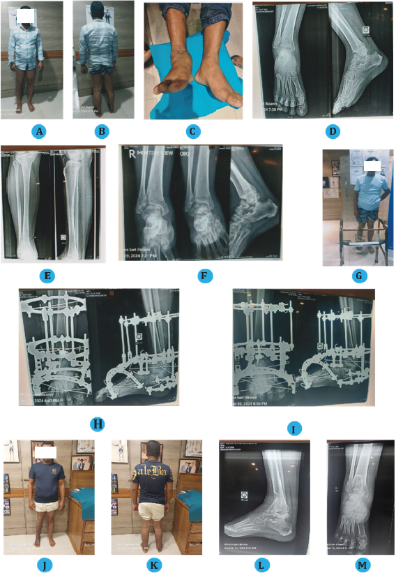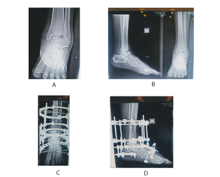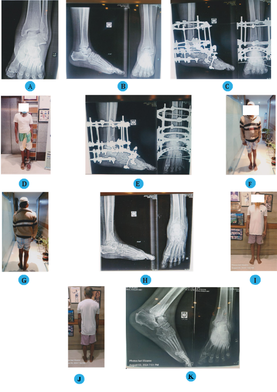 The Ilizarov technique allows for precise stabilization of the talus, promoting healing osteogenesis. This is particularly bene cial for complex injuries, where traditional methods such as bone grafting and prolonged non-weight bearing have shown limited effectiveness. Our results demonstrate that this technique not only stabilizes the fracture but also enhances the likelihood of successful union and preserves function at the subtalar joint.4–6 Additionally, the absence of limb shortening in our patients indicates that Ilizarov's method maintains the foot-ankle relationship, which is critical for overall mobility and quality of life. These positive outcomes reinforce the technique's role as a viable option in orthopedic practice, particularly for challenging talus injuries (Case 1 & 2).