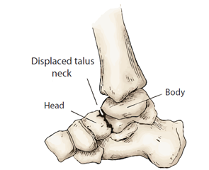 The talus, which has 60–70% of its surface covered in articular cartilage and no muscular attachments, is essential for ankle movement. Talar fractures are uncommon, making up 0.3% of all bone fractures and 3.4% of foot fractures, predominantly affecting males (up to 73%). These fractures typically occur in the neck of the talus and result in significant pain, swelling, and an inability to bear weight, with possible complications including avascular necrosis and post-traumatic arthritis.