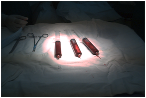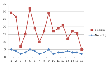All patients treated by injection of autologous bone marrow aspirates which obtained percutaneous from the iliac crest. Site of aspiration was changed every 3 ml. either in depth or directions. According to the size estimated by the MRI the amount of bone marrow is aspirate was obtained on heparinized syringes (Figure 1). Percutaneous injection of bone marrow to the site of the cyst till resistance for injection and cyst cannot contain more aspirates. Many cases has to aspirate the blood contents of the cyst before injections; especially those whom coming without previous fractures. Amount of aspirated marrow reduced every time and needs for aspirates in the last injections may not need to more than 5-7 cc. of aspirated bone marrow. Average numbers of injections were 4.4 times ranged from 3-6 with time intervals between injections 2-3 weeks (Table 1). Clinical evaluations every visit and routine X-ray before injections has to be obtained to follow up the progress of healing. Average size of the defect was 2.3 cm. and average amount bone marrow/inj. Was 10.2 cc.