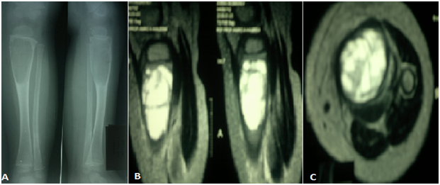 Figure 2 Juxta articular tibial aneurismal bone cyst close to proximal phuses in 3 years old girl A. Plain X-ray AP and lateral B,C: MRI of the same case sagittal and axial cuts shows septum and how the cyst is close to physes.