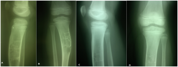 Figure 3 Follow up X-ray for the girl A,B: 2 years follow up with formed tibia, C,D : 3 years follow up of the patients with remodeling of the tibia and normal consolidated bone.