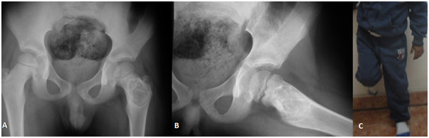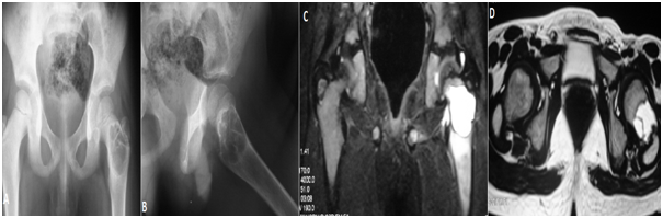 Figure 4 A, B: Plain X-ray with proximal femoral Aneurysmal bone cyst AP and Lat. C,D: MRI pelvis with huge cyst close to the physes.