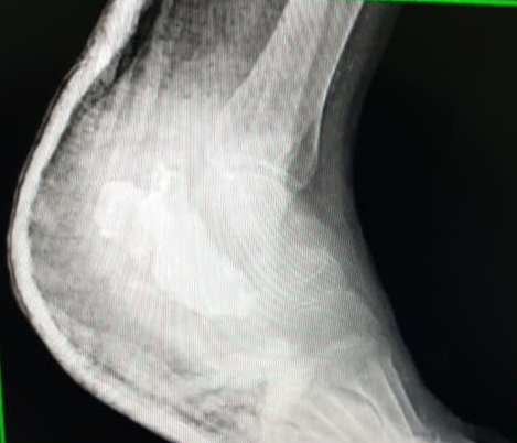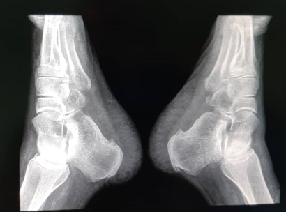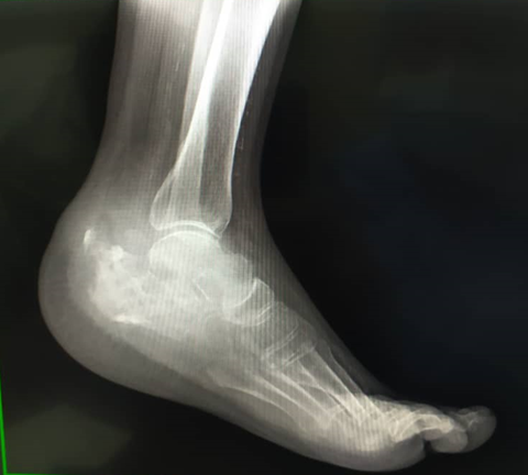 In November 2019, started feeling some mild pain at the hind foot without limitations for walking, asking for medical evaluation in December, being performed an infiltration with steroids (triamcinolone). After that, he presented some functional limitations, changing his walking pattern, being decided to send him to a rehab center where after some therapy sessions didn’t show any improvement, developing an ulcer at the medial aspect of his left hindfoot, which started producing a secretion of very bad aspect, and smelling very bad, starting antibiotic treatment in an empiric manner, reaching negative cultures by the month of march of 2020. Again, is evaluated by his treating doctor in November that same year, an MRI of his foot is performed, showing changes in its bony structure, affecting the cortical bone of the calcaneus, and an expanding growing of the lesion, being suggested a chronic neo proliferative growing vs. chronic infectious process.