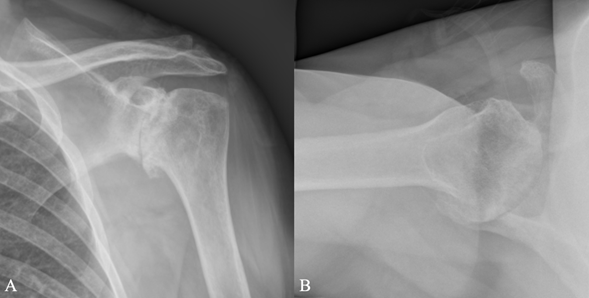 Figure 1 Preoperative plain radiographs of left shoulder in both A) anteroposterior and B) axillary views.