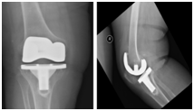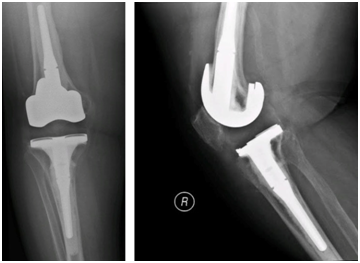 The patient was started on antibiotic treatment with doxycycline for six months plus rifampicin and streptomycin for three weeks. After two months, the patient had a second-stage total knee replacement (Figure 2). After surgery, she was discharged on streptomycin and rifampicin. In her three-year follow-up, the patient was doing fine, she had a full 0 degree of right knee extension and 100 degrees of flexion, walks with a cane as a baseline after her spine surgery, and had no signs of prosthetic failure (Figure 3).