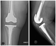 A provisional diagnosis was made for prosthetic joint infection (PJI) of the right knee and she was admitted for two-stage total knee replacement revision surgery. Her routine laboratory investigations were normal except for the erythrocyte sedimentation rate (112mm) and C-reactive protein level (44.3mg/L), which were both elevated. An analysis of knee synovial fluid aspirate indicated a normal white cell count and was negative for organisms after staining. Plain radiological investigations of the right knee showed signs of component loosening (Figure 1).