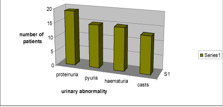 Results: From 25 patients Female to male ratio 2.3:1. Age at diagnosis range from 4 to 15 years with mean of 9 years. Duration of symptoms before diagnosis established range from one month to 7 years with mean of 8 months. Frequency of SLE classification criteria as follows: +ve ANA 95%, renal disorder: 84%, immunological disorder 60%, photosensitivity 48%, oral ulcers 48%, Hematological disorder 44%, arthritis 36%, serositis 28%, malar rash 12%, discoid rash 4%, neurological disorder 0%. Other clinical manifestation of SLE include fever 80%, arthralgia and anorexia 84% each, hair fall 40%, abdominal pain 36%, other skin manifestation 24%, headache 20%,dyspnea and palpitation 16% each, Reynard’s phenomena and lymphadenopathy 12% each. The most frequent hematological abnormality: elevated ESR: 100% anemia: 72%, leucopenia: 44%, thrombocytopenia: 20%, leukocytosis: 12%, thrombocytosis 8%, lymphopenia: 4%.