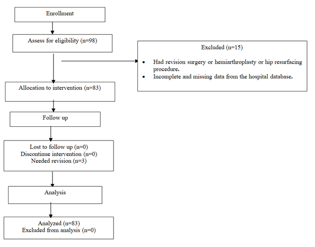 Methods: This is a retrospective cohort study of THA cases performed between 2010 and 2019 at a tertiary center in Saudi Arabia. Retrieved data include patients’ ages at the time of surgery, chronic diseases, presurgical diagnosis, site and duration of surgery, and postoperative complications.