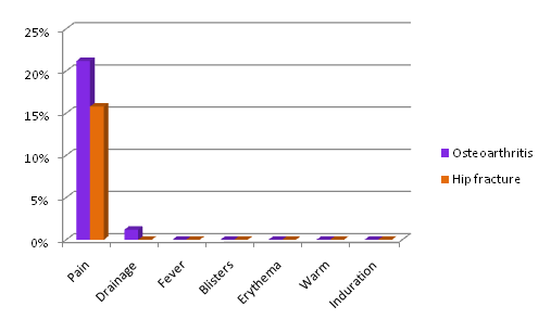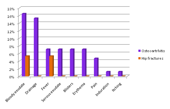 The three infections reported were superficial, there being no deep or mixed infections (superficial infection that becomes deep). No infection was recorded in patients admitted for hip fracture. In the group of patients undergoing THR due to osteoarthritis, bloody exudate and drainage were the signs / symptoms more common observed, on the other hand, itching and induration were relatively rare in the sample studied. However, in the group of patients undergoing THR due to hip fracture, the only signs / symptoms recorded were fever and bloody exudate, not showing any of the other ones (Figure 1).