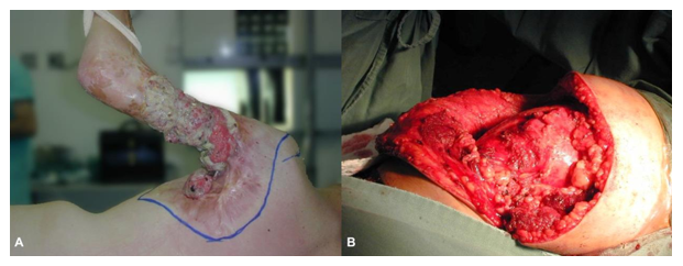 Figure 4 Patient with squamous cell carcinoma at the root of the left upper limb (LUL), in lateral decubitus and tied to the ceiling (A). Operative wound after limb removal (B).