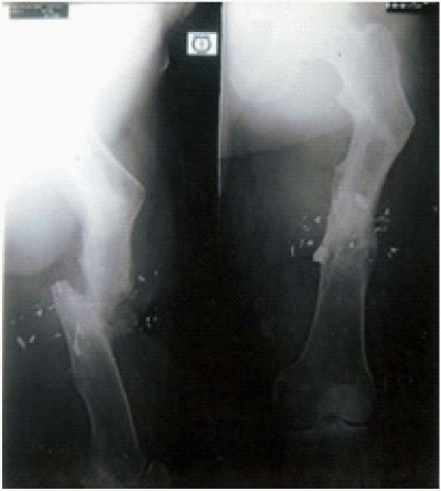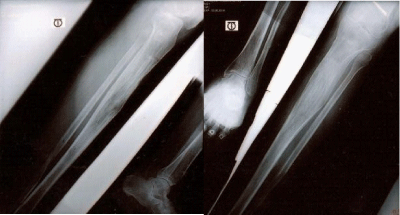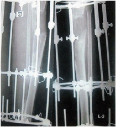 Osteogenesis and tissue genesis of the distraction gap was achieved in all the 86 patients. Gradual distraction formed early callus. This callus then forms parallel fibers of collagen,4 as the distraction proceeds. These collagen fibers begin to ossify & ultimately the solid bone remodels into cortex & medullary canal. The results are presented in Figure 1–9. The most common complication was pin track infection. Pin track infection required local treatment. There were no incidents of pin track osteomyelities. Oedema of leg & foot was always present. Joint stiffness of knee & ankle occurred very often but after removal of fixator the rehabilitation of these joints resulted to full recovery. There were no incidents of neurovascular complications.