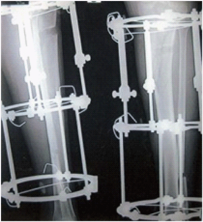 With the current experimental and clinical experience it is evident that regeneration of bone at the site of distraction can be obtained safely. For successful bone transportation, it is also important to maintain the bone ends in good and stable position. In order to provide firm stability and to avoid axial deviation during distraction, the assembly of fixator in our cases usually required one or two rings proximally, 1 in the intercalate segment and 1 or 2 distally. Another important factor is to achieve good contract of the bones, when the transported fragment contacts the bone surface at the target zone (opposite the segmental defect). A partial contact in 1 of our cases was the cause of non-union. The importance of controlling precisely the movements of the transporting bone fragment has been emphasized by many authors.8–10