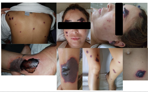 Woman, 34 years old, with a history of aplastic anemia, no prior pregnancies, presents with a 7-day history of painful purpuric lesions on the cheeks, eyebrows, ears, trunk, and limbs. Denied illicit substance use. Physical examination reveals multiple palpable erythematous-violaceous plaques with a peripheral erythematous halo and central hemorrhagic bullae.